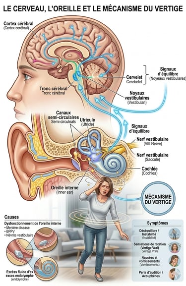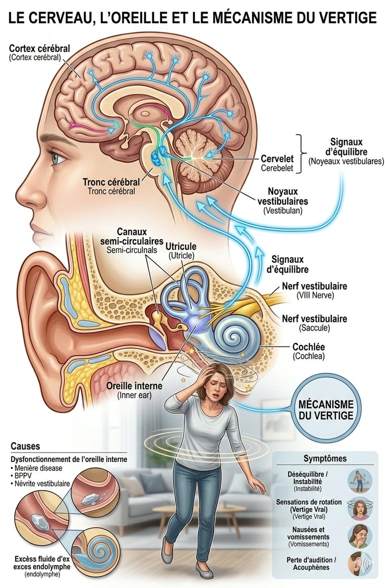 VPPB (Vertige Positionnel Paroxystique Bénin) : C’est l’une des causes les plus fréquentes. Il se produit lorsque de petits cristaux dans l’oreille interne se déplacent et perturbent la fonction de l’équilibre.